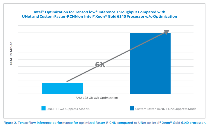 Faster R-CNN has also played a role in segmentation analytics in the medical field. Faster R-CNN is well optimized by Intel Optimization for TensorFlow and Intel MKL-DNN, which results in a performance gain of 6X compared to UNet* (see Figure 2).