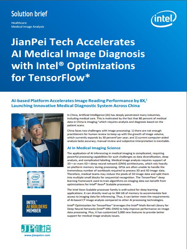 Intel worked with JianPei Tech to optimize their image- reading robot on Intel Xeon Scalable processors for inferencing of X-ray, CT, MRI, and other medical imaging sources. To accelerate image analysis, JianPei Tech’s plat-form was migrated to Intel? Xeon? Gold 6140 processors and optimized with Intel Optimization for TensorFlow, which includes the Intel MKL-DNN library.