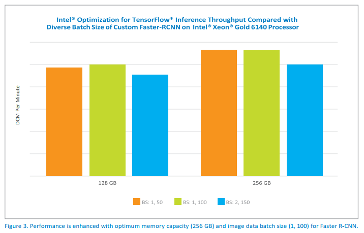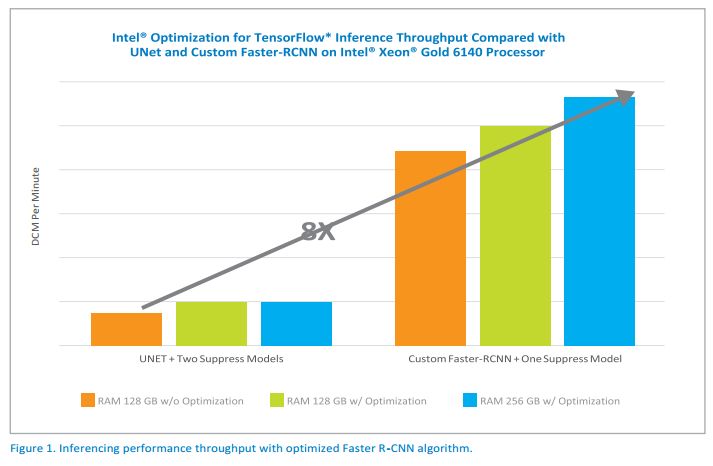 As shown in Figure 1, the collaborative work resulted in achieving an 8X performance improvement on DICOM (Digital Imaging and Communications in Medicine) images (identified as DCM in Figure 1).1 The speedups were a result of using Faster R-CNN* (Region Convolutional Neural Network) instead of UNet* and optimizing the Faster R-CNN algorithms for Intel Xeon Scalable processors.