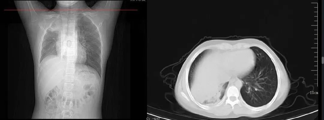 影像所見: 右肺內(nèi)帶見片狀軟組織樣高密度影,右肺野內(nèi)亦可見片狀高密度影,右側(cè)肋膈角變淺變鈍,膈面模糊??紤]右肺部分不張伴胸腔積液可能。