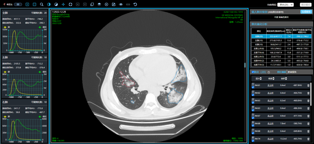 從這3個確診新冠肺炎呈“白肺”病例來看,“白肺”多見于老人、兒童以及帶有基礎(chǔ)病的新冠患者,病灶可發(fā)生在肺內(nèi)任何肺葉,病灶形態(tài)特點(diǎn)也是多樣化,符合病毒性肺炎的影像表現(xiàn)。從影像學(xué)角度出發(fā)重點(diǎn)在于快速評估病情,提升人工讀片的客觀性。 “啄醫(yī)生閱片機(jī)器人??新冠肺炎CT影像輔助分診與評估系統(tǒng)”可以準(zhǔn)確地識別新冠肺炎的典型影像表現(xiàn)如雙肺外周胸膜下多發(fā)的磨玻璃影、小葉間隔增厚或合并鋪路石征等,對于部分患者由于影像表現(xiàn)早于臨床癥狀,更具有早期發(fā)現(xiàn)、早期診斷的優(yōu)勢。