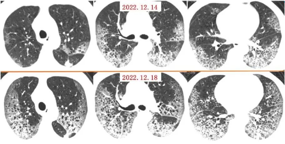 影像所見:發(fā)熱12天,胸悶、氣喘7天。胸部CT顯示兩肺彌散性磨玻璃影,呈“白肺”改變,其內(nèi)可見空氣支氣管征、雙側(cè)膈面上抬。