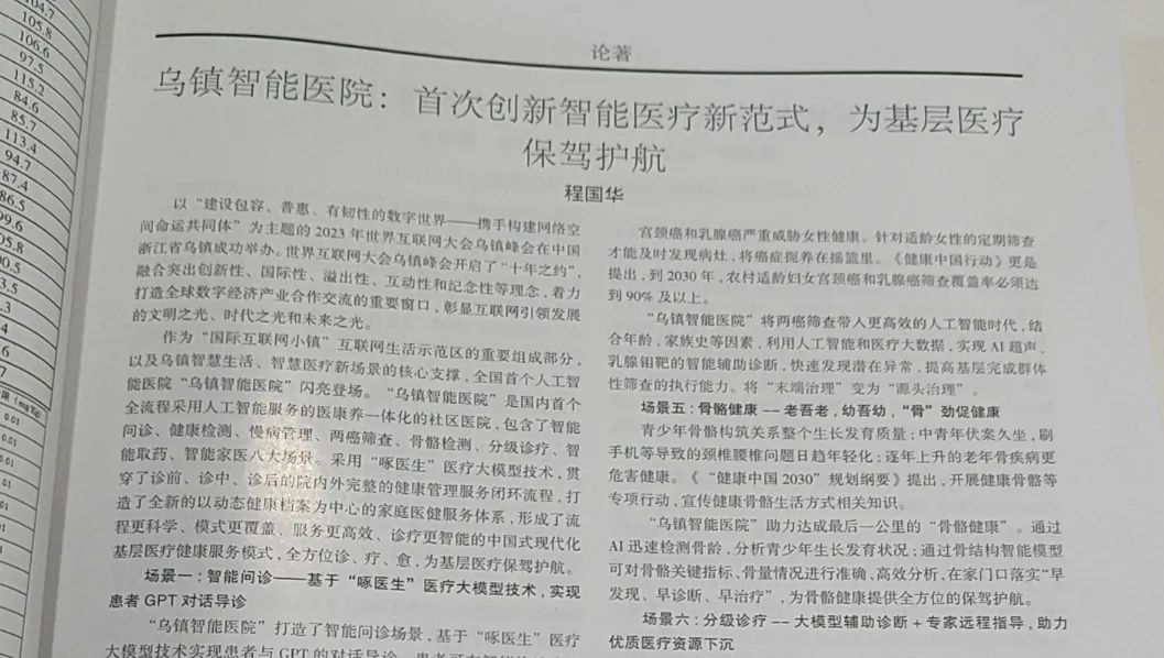 近日,健培科技CEO程國(guó)華的署名文章《烏鎮(zhèn)智能醫(yī)院: 智能醫(yī)療新范式,為基層醫(yī)療保駕護(hù)航》,在國(guó)家級(jí)優(yōu)秀醫(yī)學(xué)科技期刊《智慧醫(yī)學(xué)(2023年11月第32期)》發(fā)表。這是近期2023年世界互聯(lián)網(wǎng)大會(huì)?烏鎮(zhèn)峰會(huì)上,全國(guó)首個(gè)人工智能醫(yī)院“烏鎮(zhèn)智能醫(yī)院”開業(yè)之后,一次全面的闡述人工智能醫(yī)院的內(nèi)容與功能。作為國(guó)內(nèi)首個(gè)全流程采用人工智能服務(wù)的醫(yī)康養(yǎng)一體化的社區(qū)醫(yī)院,文章中針對(duì)智能問(wèn)診、健康檢測(cè)、慢病管理、兩癌篩查、骨骼檢測(cè)、分級(jí)診療、智能取藥、智能家醫(yī)主要八大落地場(chǎng)景的應(yīng)用進(jìn)行了詳細(xì)闡述。“烏鎮(zhèn)智能醫(yī)院”采用“啄醫(yī)生”醫(yī)療大模型技術(shù),貫穿了診前、診中、診后的院內(nèi)外完整的健康管理服務(wù)閉環(huán)流程,打造了全新的以動(dòng)態(tài)健康檔案為中心的家庭醫(yī)健服務(wù)體系,形成了流程更科學(xué)、人群更覆蓋、服務(wù)更高效、診療更智能的中國(guó)式現(xiàn)代化基層醫(yī)療健康服務(wù)模式,為基層醫(yī)療保駕護(hù)航。