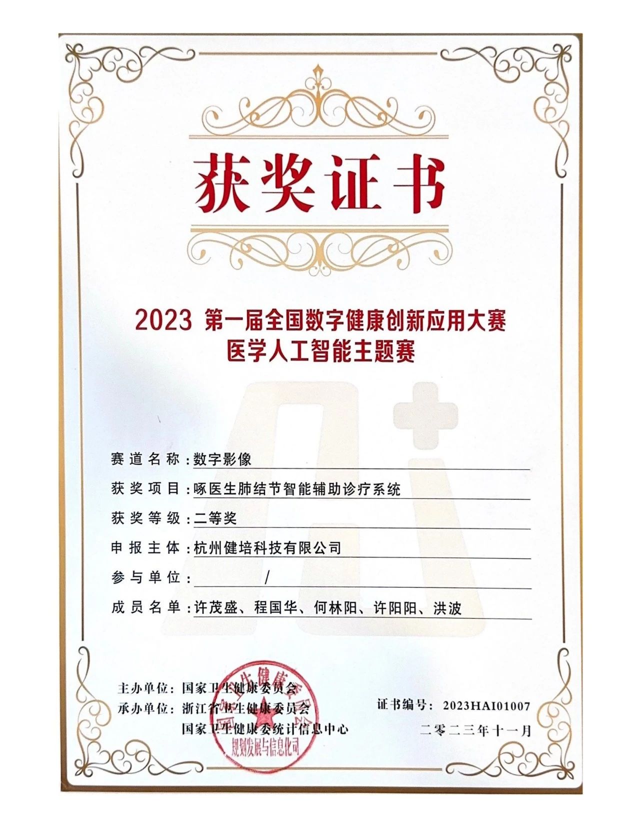 2023年第一屆全國(guó)數(shù)字健康創(chuàng)新應(yīng)用大賽醫(yī)學(xué)人工智能主題賽二等獎(jiǎng)