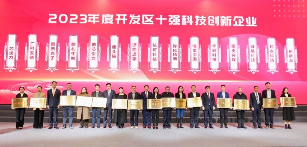 此次大會上,舉辦了2023年度蕭山經(jīng)濟技術(shù)開發(fā)區(qū)十強科技創(chuàng)新企業(yè)頒獎典禮,健培科技榮獲2023年度科技創(chuàng)新十強企業(yè)稱號,健培科技副總裁徐招海代表公司上臺領(lǐng)獎。