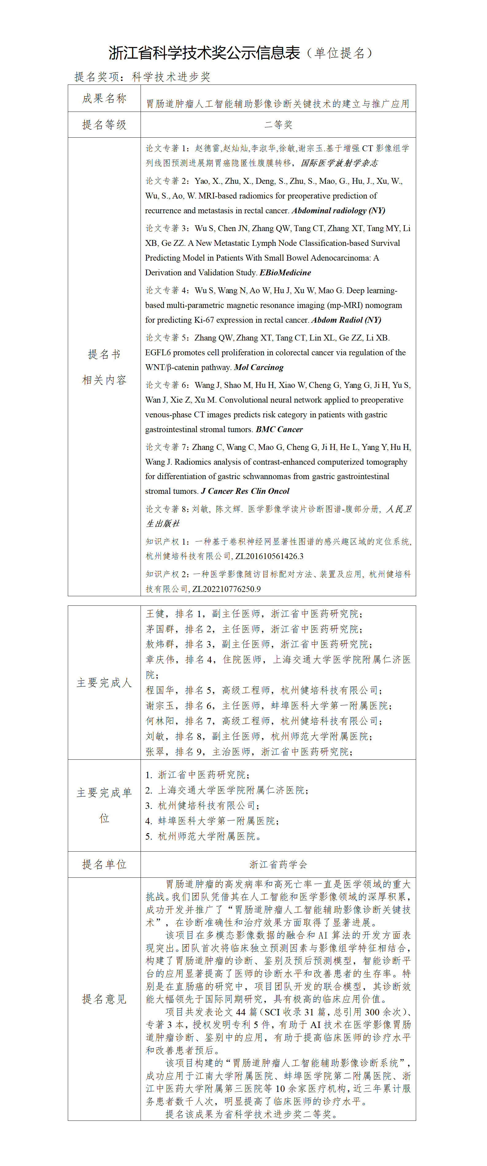 根據(jù)《浙江省科學(xué)技術(shù)廳關(guān)于開展2023年度浙江省科學(xué)技術(shù)獎(jiǎng)提名工作的通知》要求,公司參與的項(xiàng)目《胃腸道腫瘤人工智能輔助影像診斷關(guān)鍵技術(shù)的建立與推廣應(yīng)用》擬提名2023年度浙江省科學(xué)技術(shù)進(jìn)步獎(jiǎng),現(xiàn)將項(xiàng)目提名予以公示(見附件)。