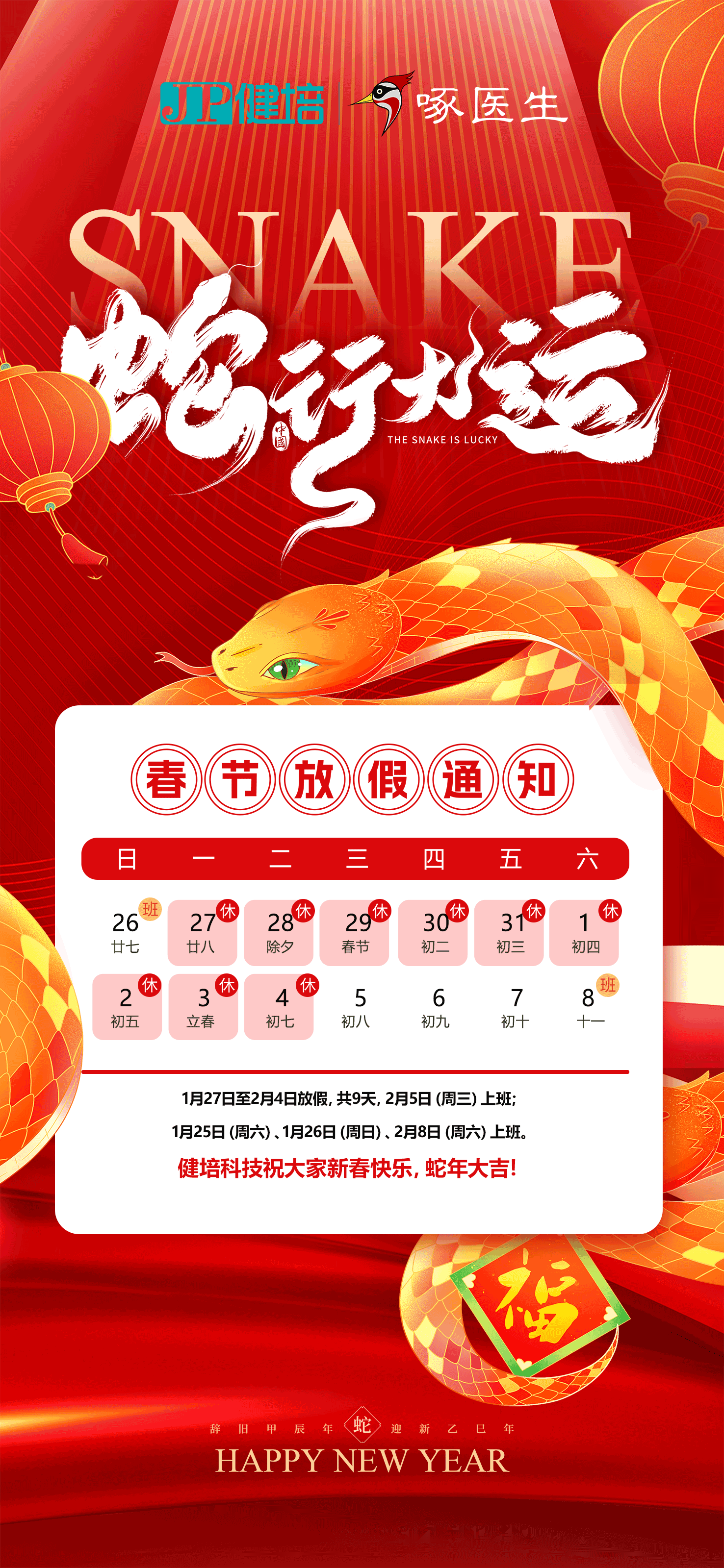 金蛇獻瑞,喜迎新春。值此新春佳節(jié)來臨之際,健培科技全體員工向您致以最誠摯的祝福和問候!感謝您一直以來對我們公司的支持與信任。根據(jù)國家法定節(jié)假日的規(guī)定,并結合公司實際情況,現(xiàn)將春節(jié)放假安排通知如下: