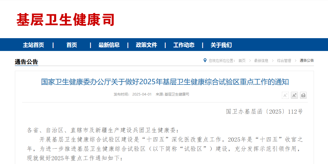 2025年4月1日,國家衛(wèi)生健康委辦公廳發(fā)布了《關于做好2025年基層衛(wèi)生健康綜合試驗區(qū)重點工作的通知》。這不是普通的政策通知,而是以“深化醫(yī)改攻堅年”為旗號,掀起基層衛(wèi)生健康服務能力“跨越式革命”的行動指南。作為“十四五”規(guī)劃的收官之年,這份文件不僅將試驗區(qū)建設納入國家衛(wèi)健委領導的重點聯系省份工作,還拋出了十大顛覆性任務,直指基層醫(yī)療的“痛點”和“未來”。