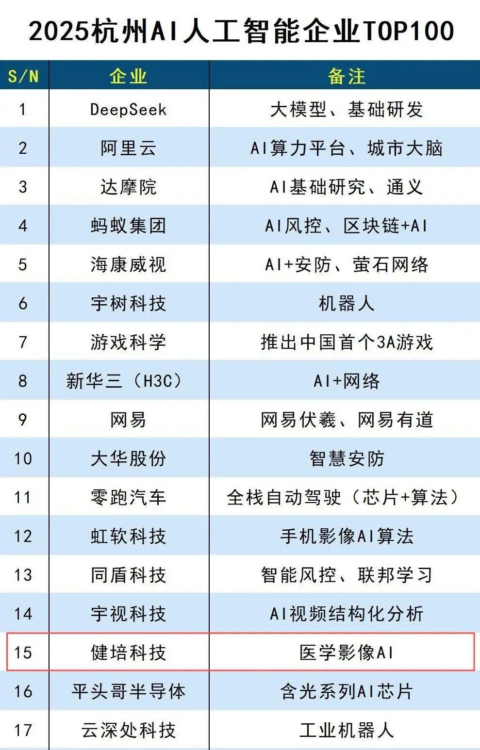 喜訊:健培科技榮登“2025杭州AI人工智能企業(yè)TOP100”榜單