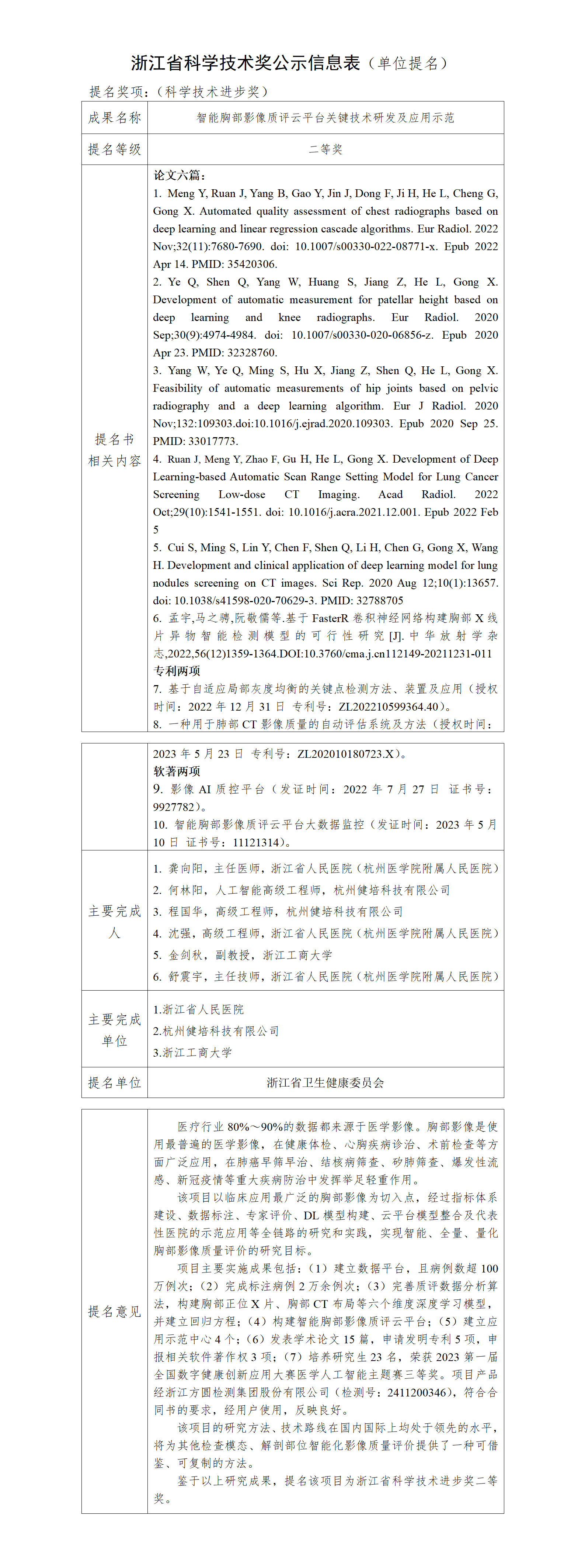 根據浙江省科學技術廳關于開展2024年度浙江省科學技術獎提名工作的通知,按照《2024年度浙江省科學技術獎提名規(guī)則》規(guī)定的標準和程序,對公司參與的項目《智能胸部影像質評云平臺關鍵技術研發(fā)及應用示范》進行公示。